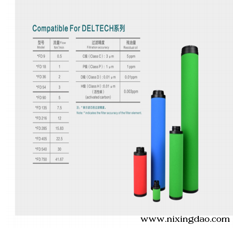 Deltech玳尔特克滤芯A级 除油过滤器 能滤除小至0.01μm的液体及固体微粒,达到低残油含量001ppm,几乎水分、灰尘和油都被去除。用于E3级过滤和吸干机之前起保护作用,冷干机之后,确b空气中不含油。
